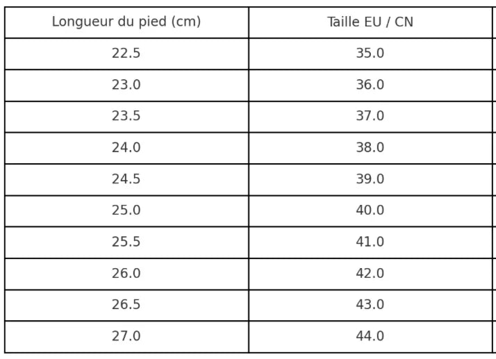📏 Tableau des tailles